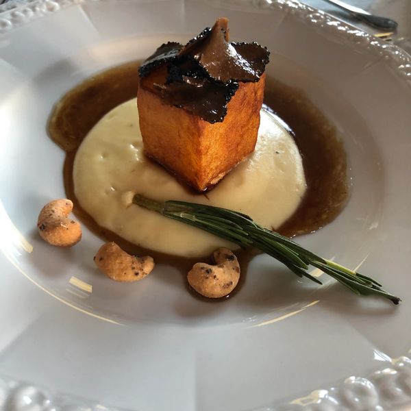 Etwas warme Trüffelespuma in die Mitte von 4 Tellern spitzen. Darauf je eine frisch frittierte, gefüllte Kartoffelkiste setzen. Den Trüffelsalat auf den Kartoffelkisten drapieren und die Madeirasauce angießen. Teller mit je einem Rosmarienzweig und 3 Cashewnüssen garnieren, dann sofort servieren.